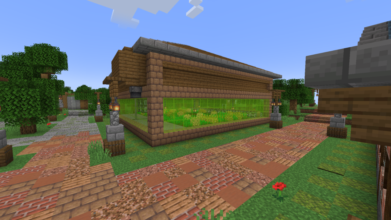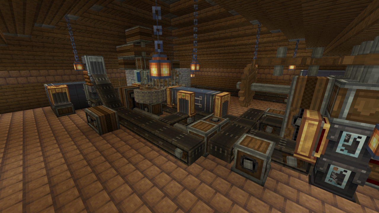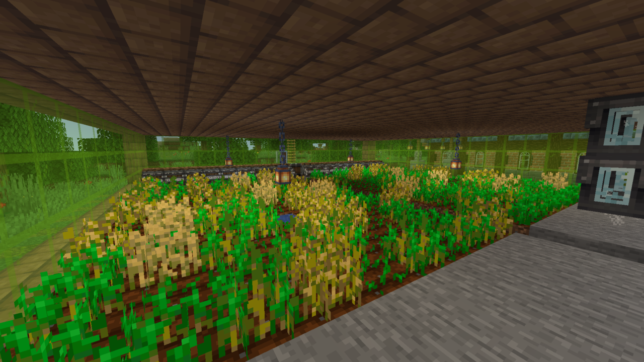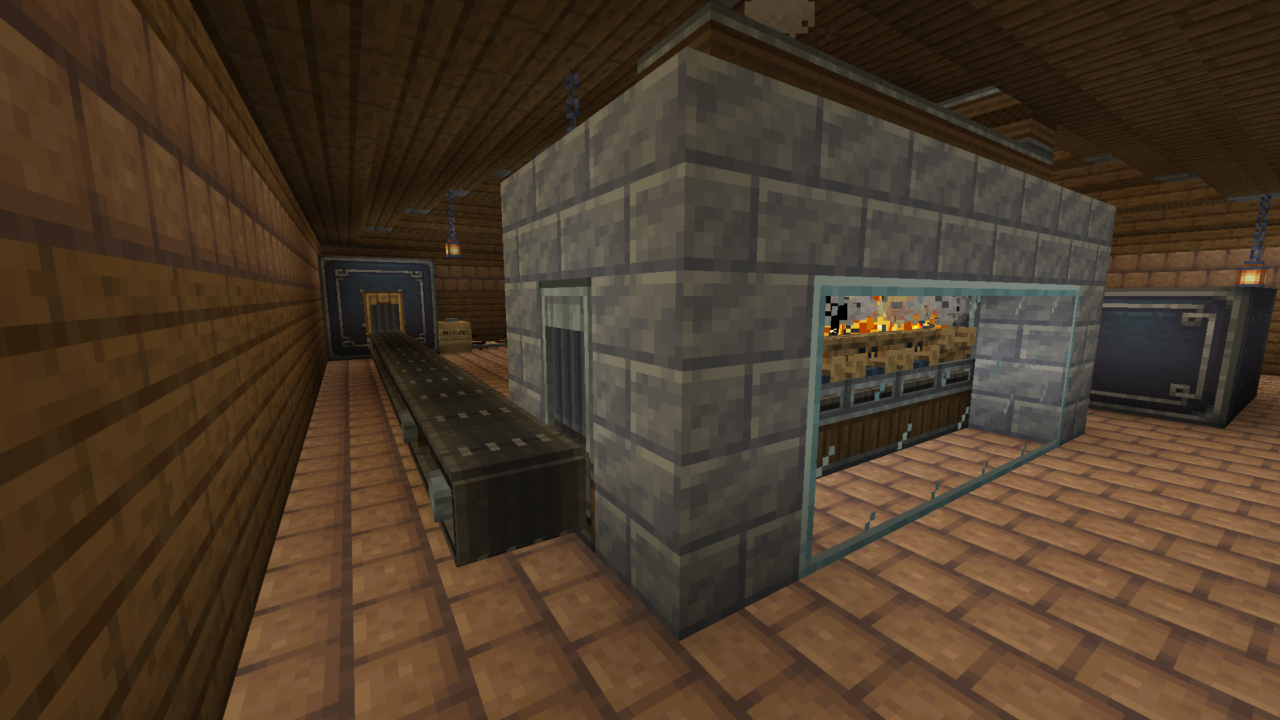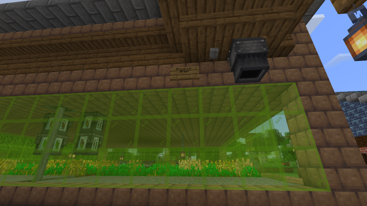 An automatic factory that harvests wheat and makes bread. It also makes bone meal as a side product. To get the farm running, you have to go to the back and climb up the ladder to get into the production floor. At the opposite side of the factory from the door is a button that you need to press, and it will start a 10 minute timer before the gantry moves, and then the carriage should move every 20 minutes (You can always adjust these times to whatever you want though), as long as the gantry is stopped moving by the time both of them have gone off). To get bread from the factory, just press the stone button at the front and it will drop off almost a stack of bread. It drops the bread in a burst of 3, so it only dispenses 63 instead of 64.