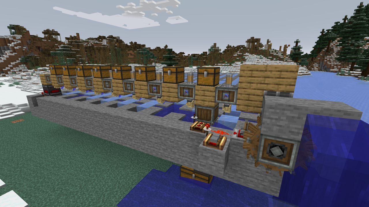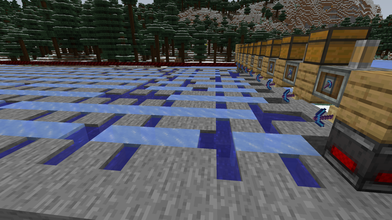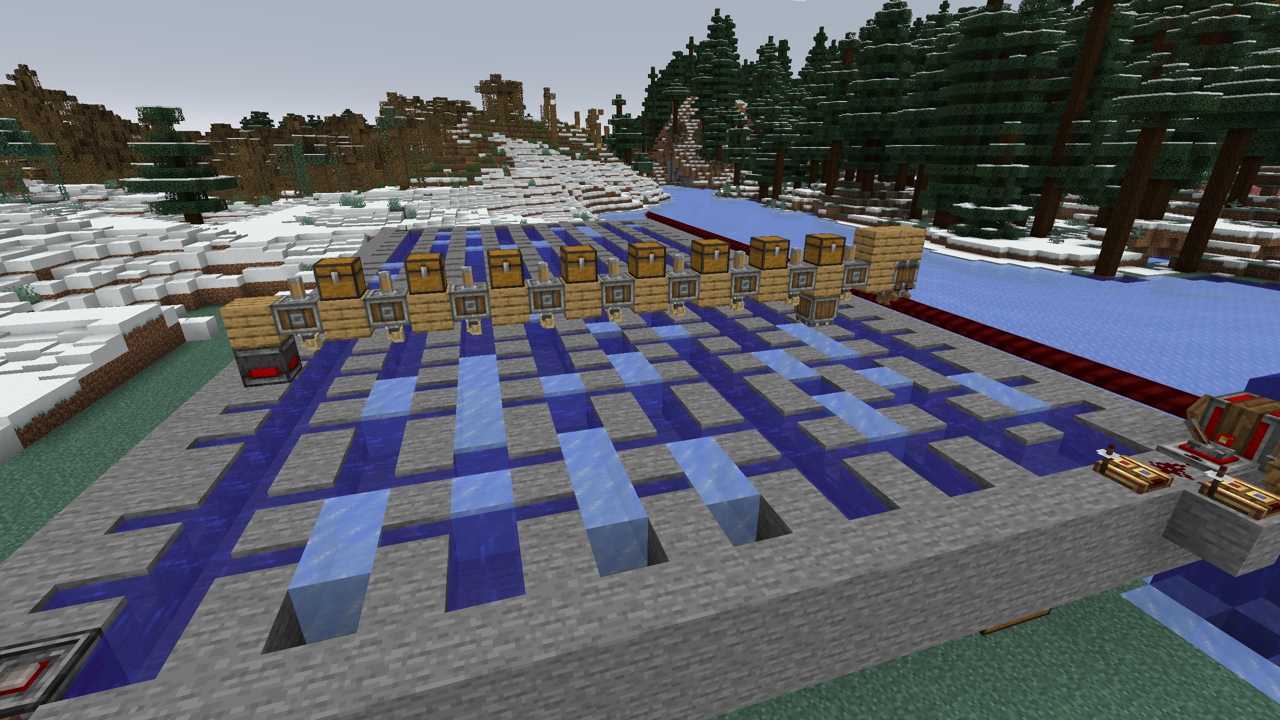 This is a basic ice farm I created which generates about 2000 ice per hour. This requires a player to be nearby and you need to supply it with silk touched pickaxes. After importing the schematic you will need to place water on each stair block and then also place some water or lava to power the water wheel. Then simply flip the powered toggle latch to start the farm. Ice will be outputted into the chest under the farm itself.
