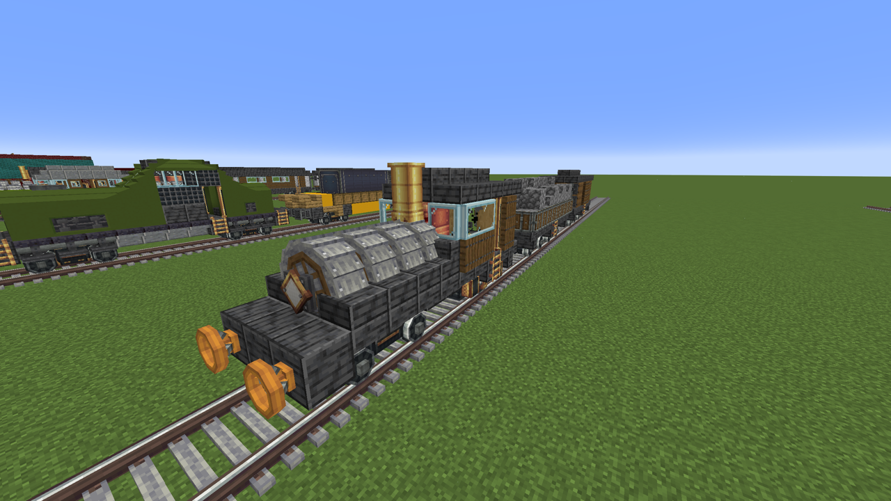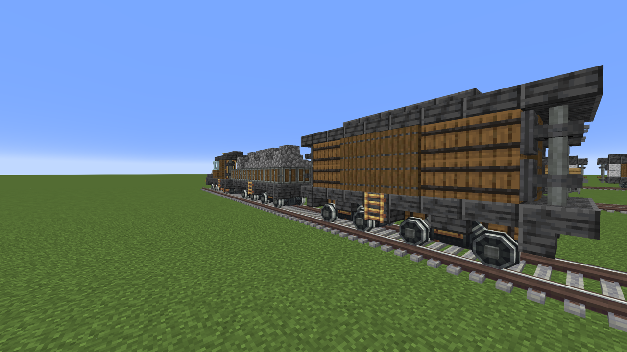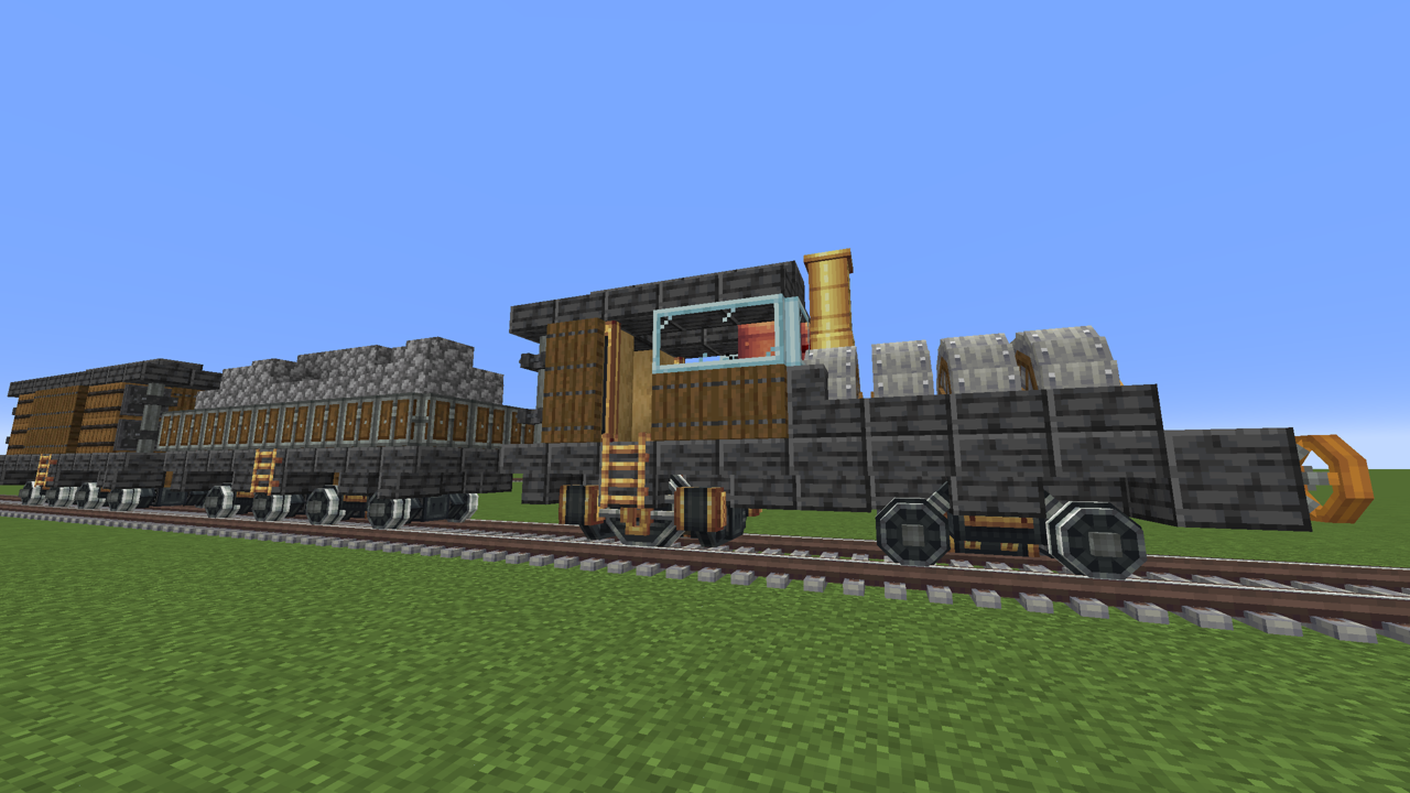 This is a train I designed for my server which is used for transporting any type of items but is themed more for cobblestone. There are portable storage interfaces on top which are sort of hidden and hard to see that a station could connect to.