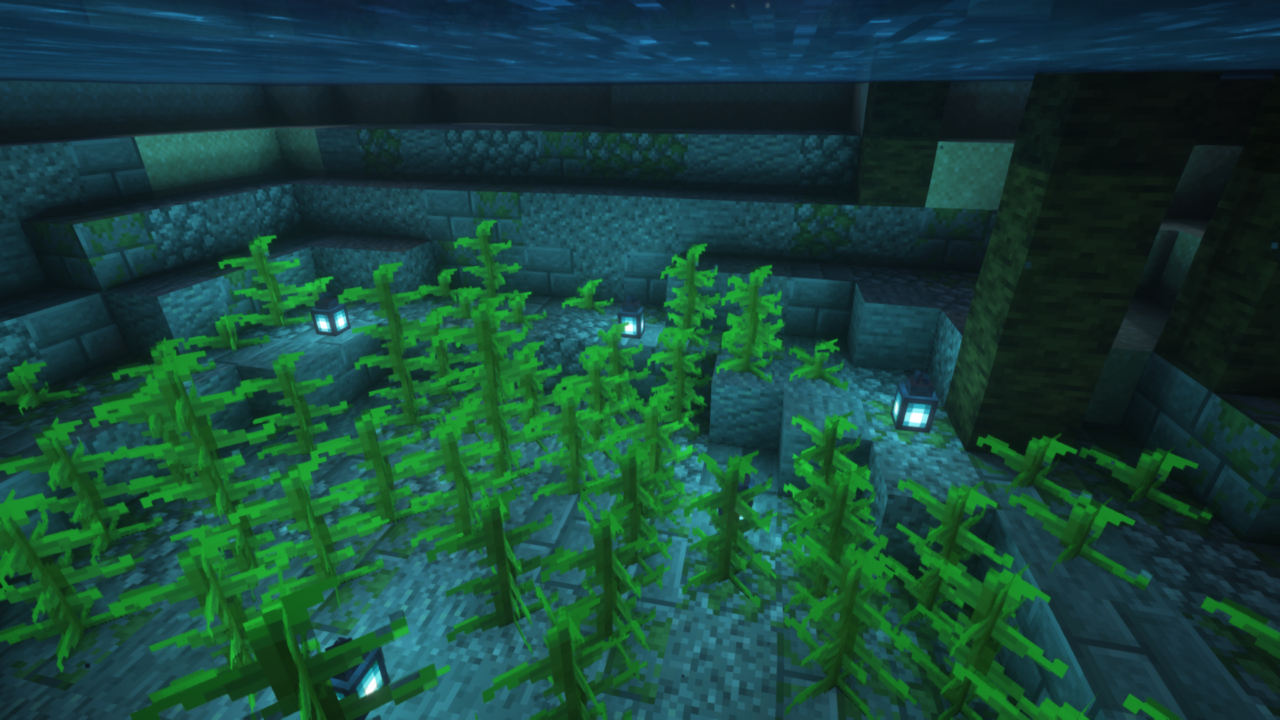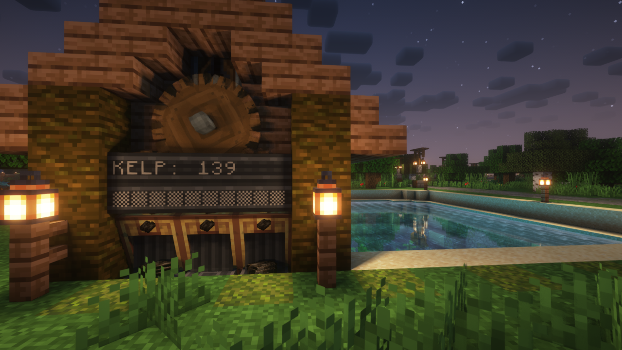 This Kelp farm is a relatively compact design. Here's how to get it working: 1. Fill the lake with water 2. Make sure the waterwheel is spinning 3. Replace the vault and the Display Board 4. Right click, then press the "ESC" button on every display link (there's 2) 5. Find the sign that says "Maintenance" and go down the hatch 6. Make sure that the car assembler is on "lock rotation" 7. Move the redstone block down one, and push the minecart so it starts moving 8. Replace the kelp 9. Inside the shack, at the top, press the button (left side) 10. (Cosmetic) Move all the blocks above the harvesters down one so that the contraption is concealed There you go! Your kelp farm should be setup!